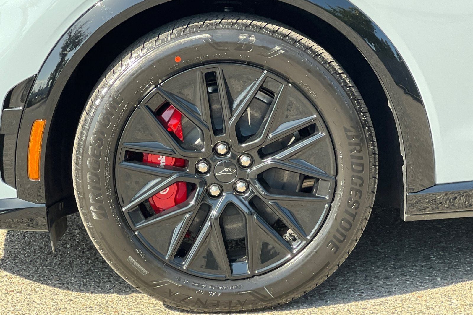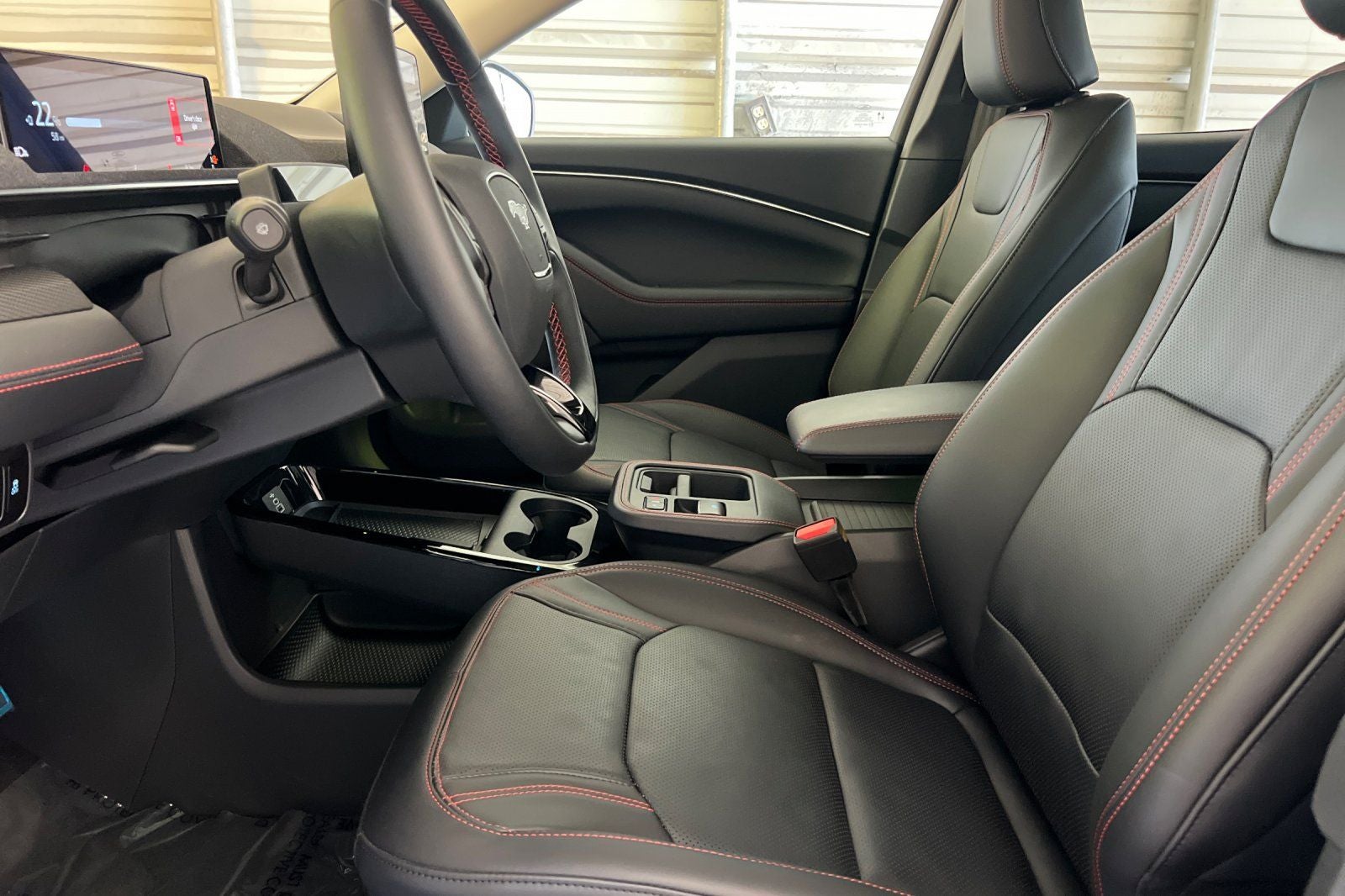 The Sport Appearance Package adds a touch of sporty flair, with unique red accent stitching, black-painted exterior accents, and 19-inch Monochromatic High Gloss Black-Painted wheels. Brembo-branded front brakes with red-painted calipers provide confident stopping power, while the distinctive front fascia and spoiler enhance the Mustang Mach-E's athletic presence.